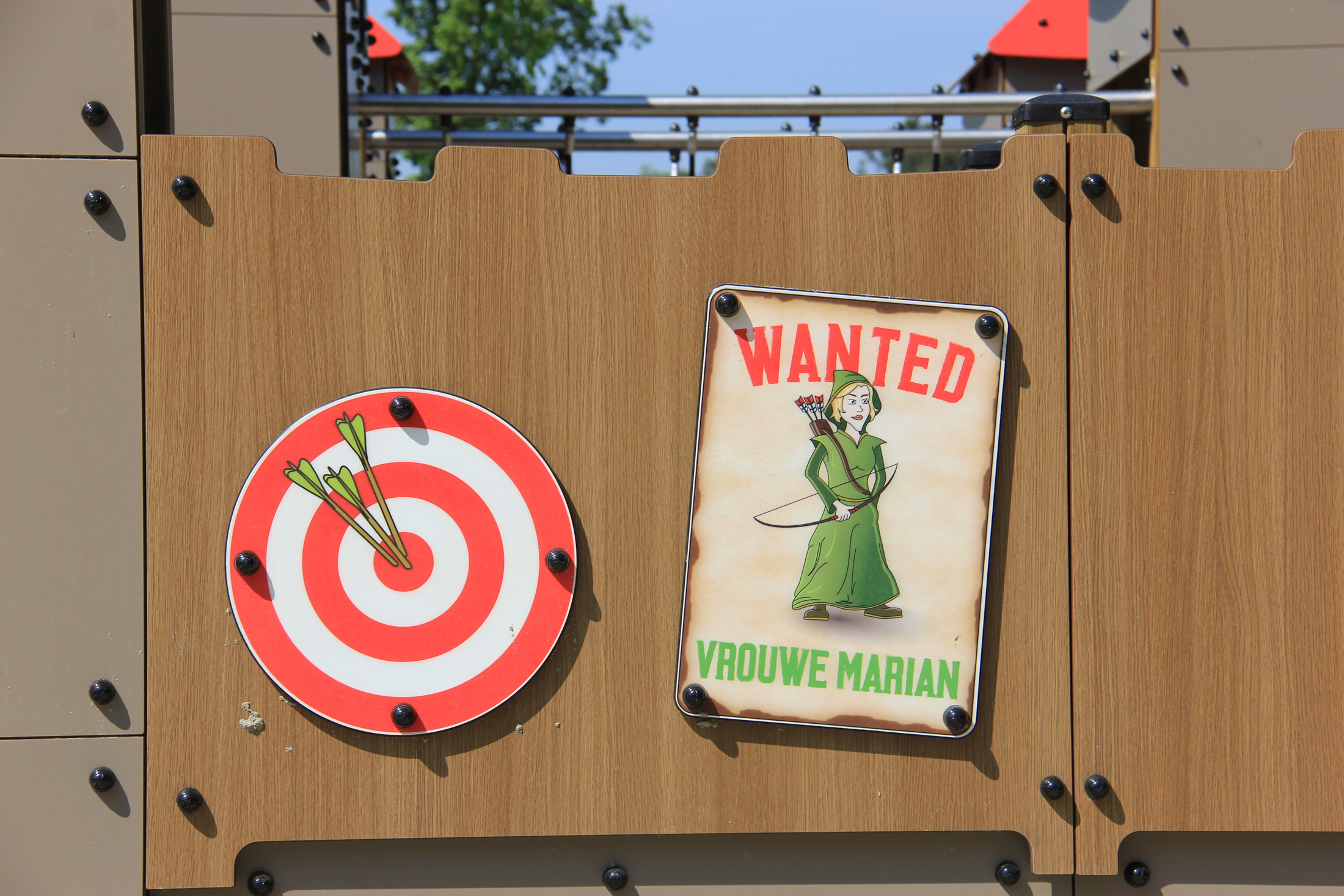 Pannelli ludici, personalizzati grazie alla tecnica del Grafic Games, rendono ancora più teatrale il parco giochi invitando i bambini a tuffarsi nella storia di Robin Hood.