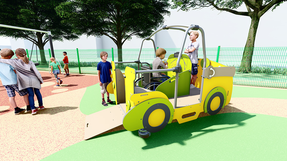 Il risultato è un’area gioco caratterizzata da superfici piane e prive di ostacoli e da strutture distanziate che consentono ai bambini in sedia a rotelle di spostarsi facilmente. La varietà delle attività, compresi i giochi musicali, permette a tutti i bambini di giocare insieme, perché per Proludic tutti i bambini devono avere accesso al gioco e agli stessi giochi.