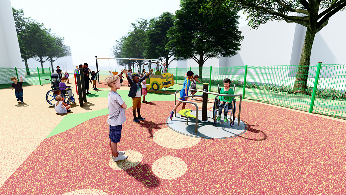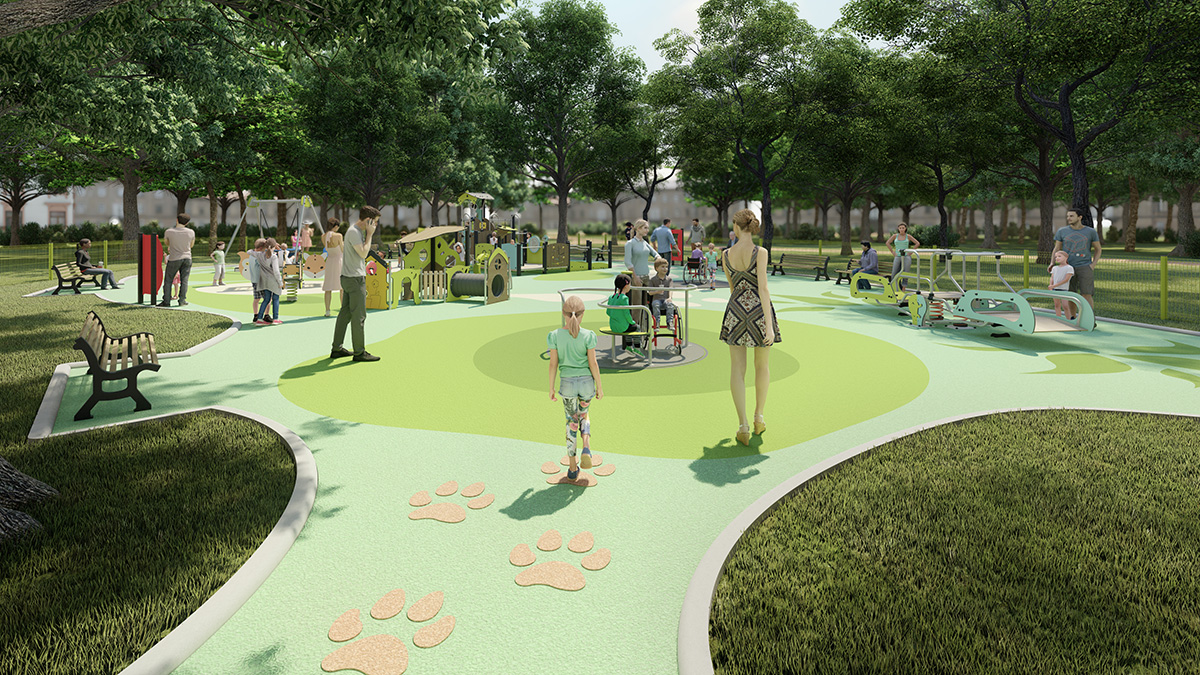 L’area gioco si trova al centro di un parco. L’allestimento offre un accesso facile e sicuro a tutti i bambini, mentre le recinzioni chiudono e delimitano chiaramente l’area gioco. Permettono, quindi, ai bambini di rimanere all’interno di uno spazio completamente protetto. La pavimentazione è stata abbellita con motivi ludici in armonia con l’ambiente circostante, mentre i giochi installati offrono attività per tutti i tipi di deficit: giostra inclusiva, trampolino, dondolo inclusivo, casetta, pannelli ludici, ecc. La vegetazione è stata mantenuta per tutelare la biodiversità e proteggere i bambini dal sole.