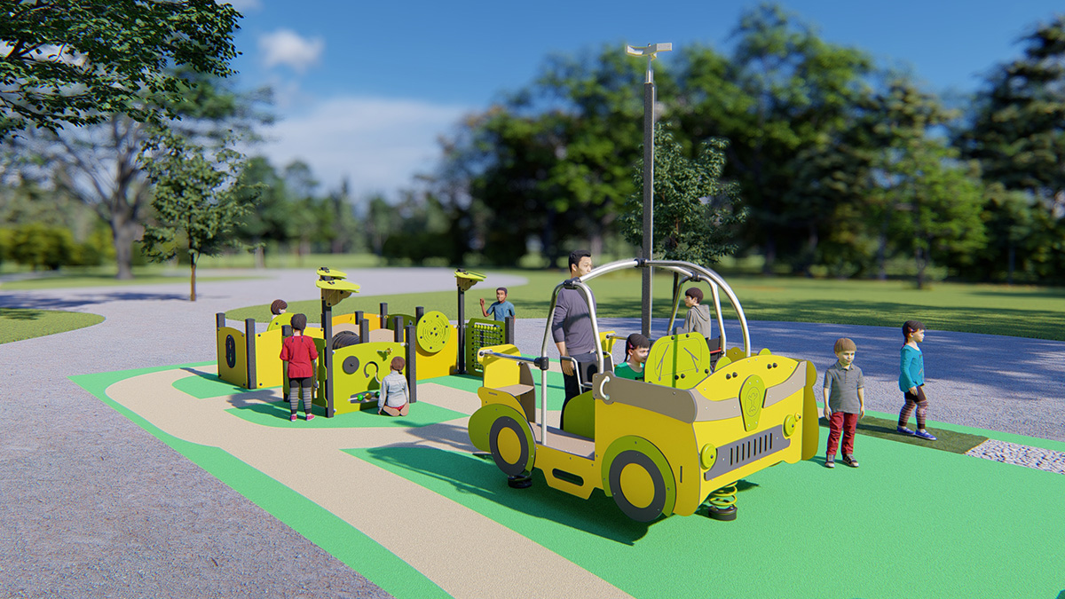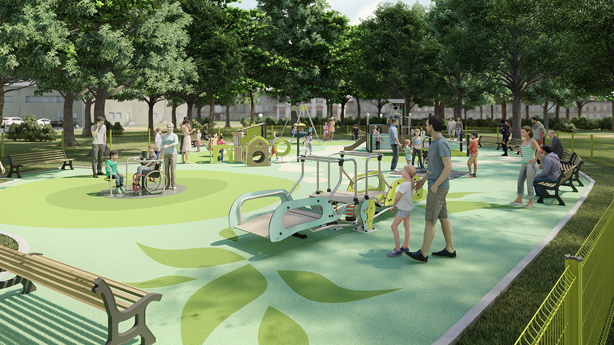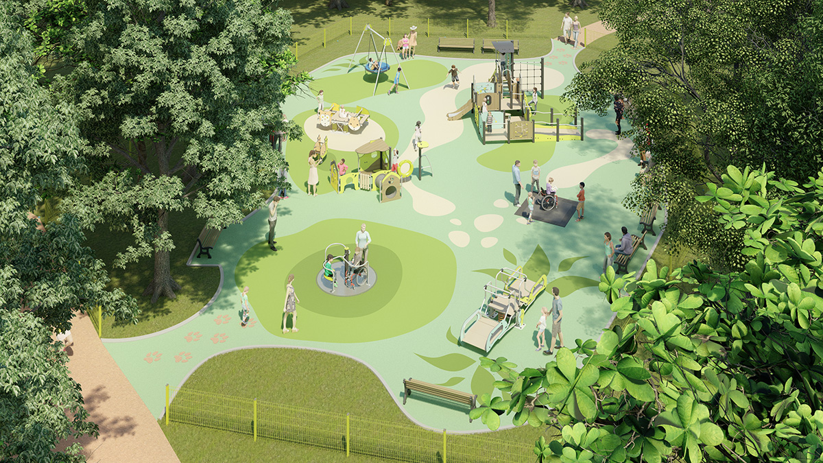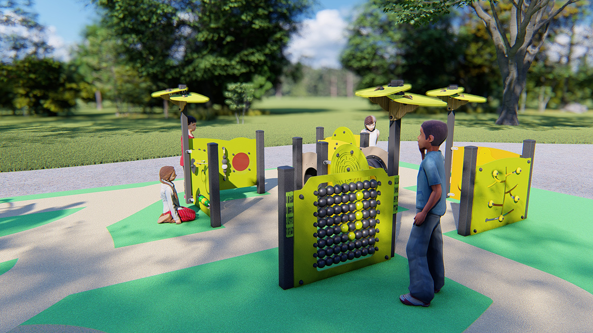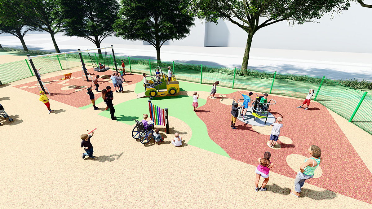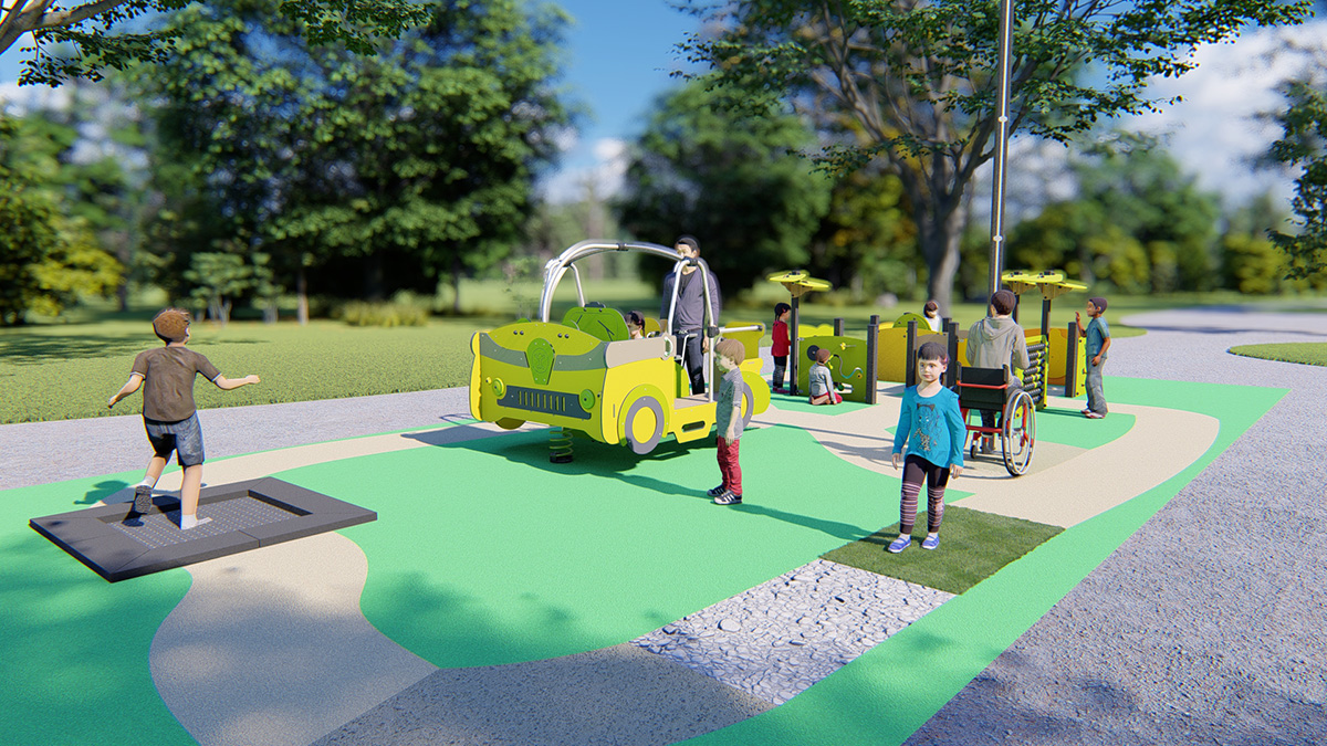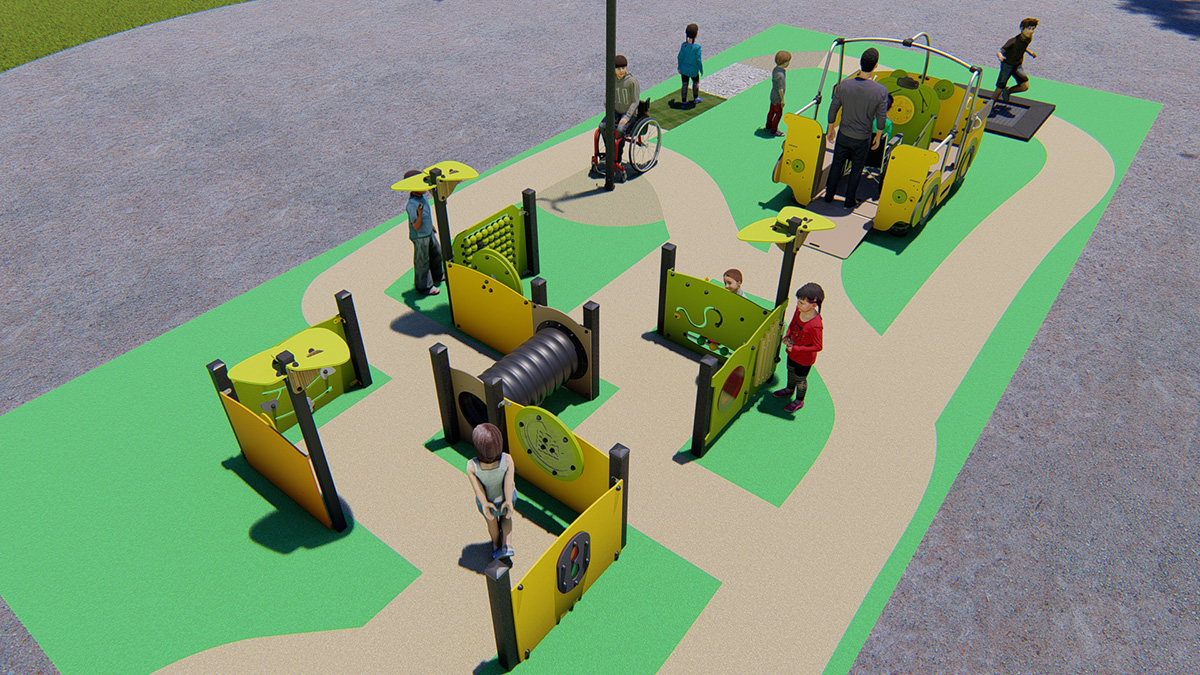 L’aire de jeux propose des structures aux formes et aux couleurs simples, dotées de solutions adaptées à toutes les déficiences : jeux au niveau du sol, structures avec rampes, jeux avec des stimulations visuelles et tactiles et jeux d’interaction.