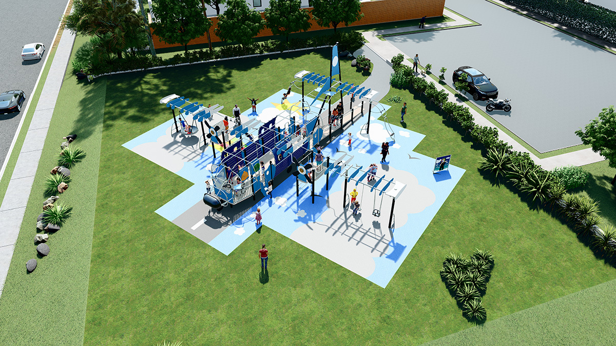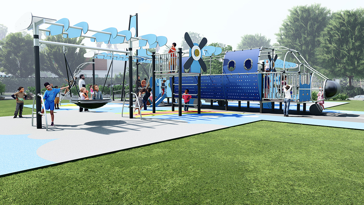 L’area gioco è stata progettata su un pavimento a tema, con forme a nuvola e colori semplici e suggestivi, per offrire a tutti i bambini la possibilità di immergersi nel mondo dell’aviazione. Il rivestimento garantisce un accesso facile ai bambini con mobilità ridotta. Una rampa di accesso larga consente loro di entrare facilmente nell’aereo, mentre l’ampio spazio interno garantisce una circolazione comoda.