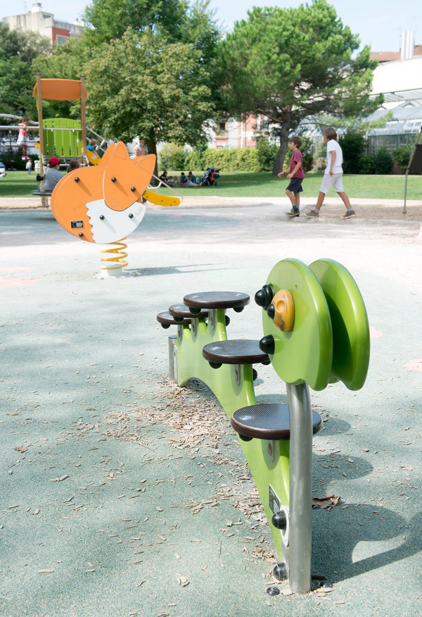 L’area giochi del “Giardino botanico” di Tolosa esplora il tema della natura, rimandando al parco stesso con gli enormi e maestosi alberi che lo circondano.