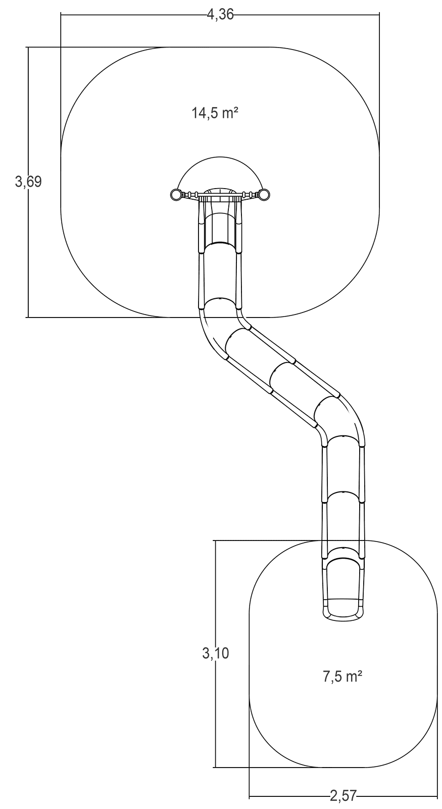 Le dimensioni del prodotto sono: 6,40 m di lunghezza, 2,70 m di larghezza, 5,50 m di altezza. L'altezza di caduta libera massima (HCL) è di 1,00 m.