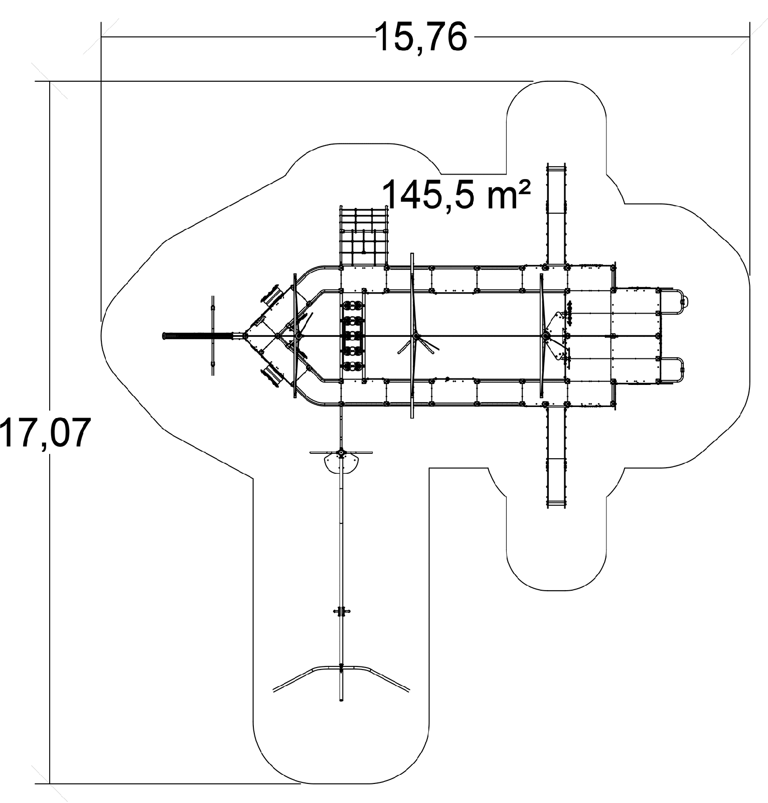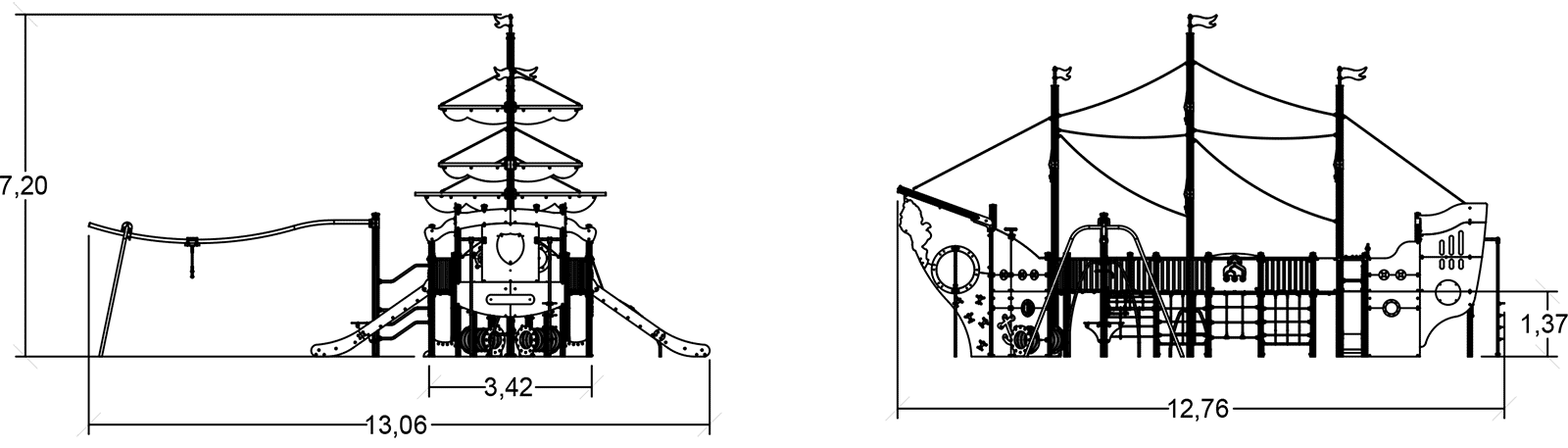 Le dimensioni del prodotto sono: 13,09 m di lunghezza, 12,69 m di larghezza, 6,90 m di altezza. L'altezza di caduta libera massima (HCL) è di 1,70 m.