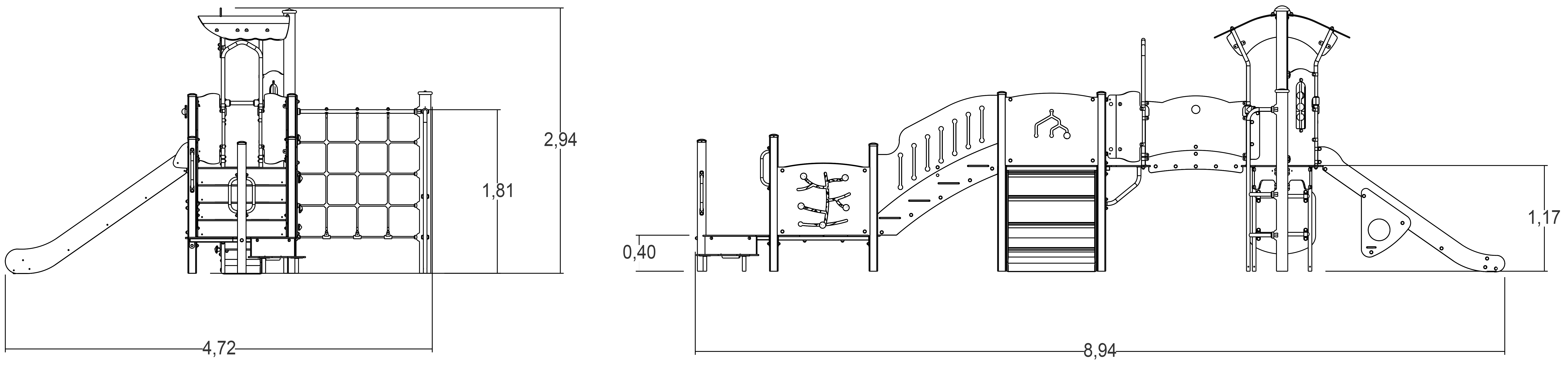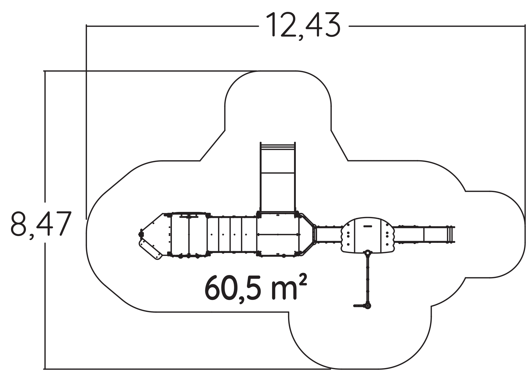 Le dimensioni del prodotto sono: 9,22 m di lunghezza, 4,70 m di larghezza, 2,94 m di altezza. L'altezza di caduta libera massima (HCL) è di 1,80 m.