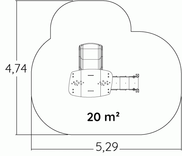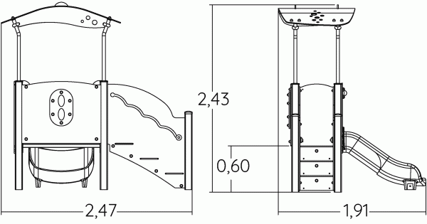 Le dimensioni del prodotto sono: 2,47 m di lunghezza, 1,91 m di larghezza, 2,43 m di altezza. L'altezza di caduta libera massima (HCL) è di 1,00 m.