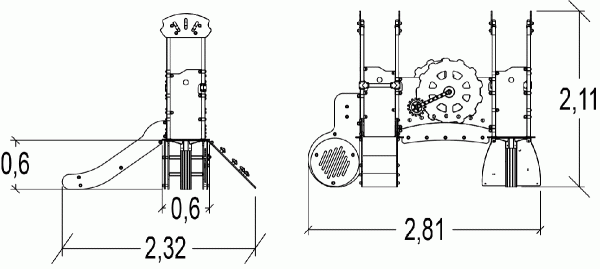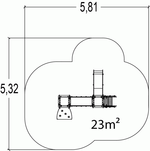 Le dimensioni del prodotto sono: 2,81 m di lunghezza, 2,32 m di larghezza, 2,11 m di altezza. L'altezza di caduta libera massima (HCL) è di 1,00 m.