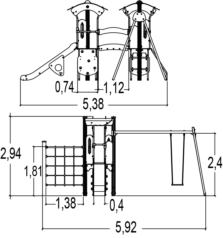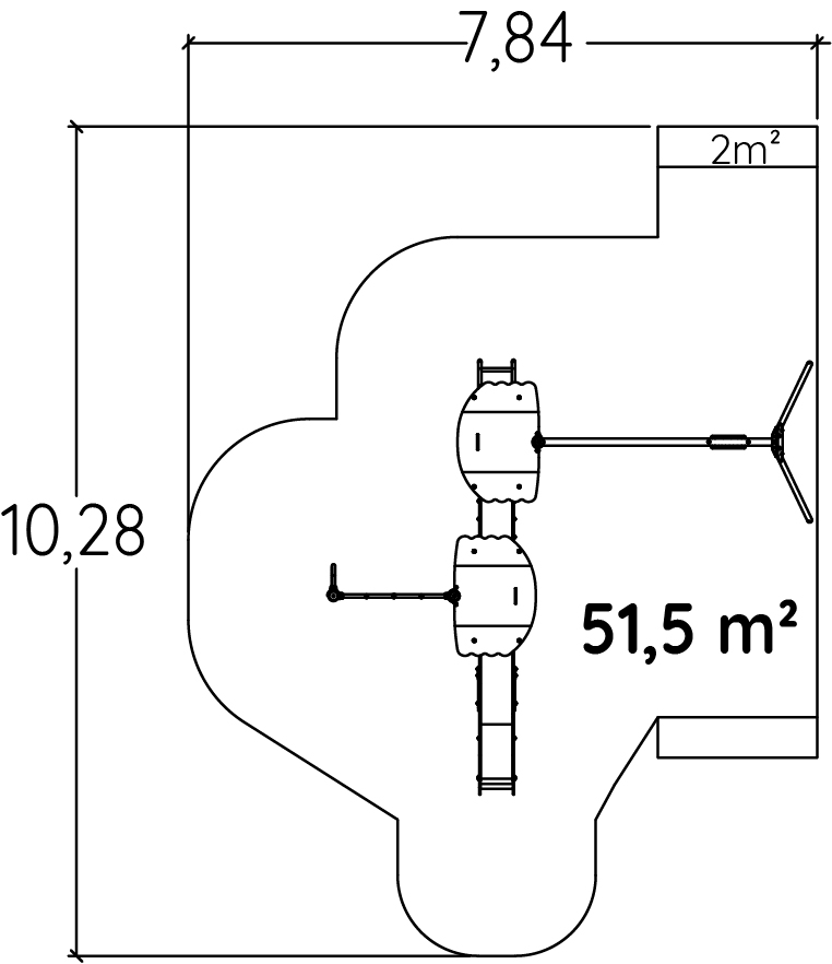 Le dimensioni del prodotto sono: 5,92 m di lunghezza, 5,38 m di larghezza, 2,94 m di altezza. L'altezza di caduta libera massima (HCL) è di 1,80 m.