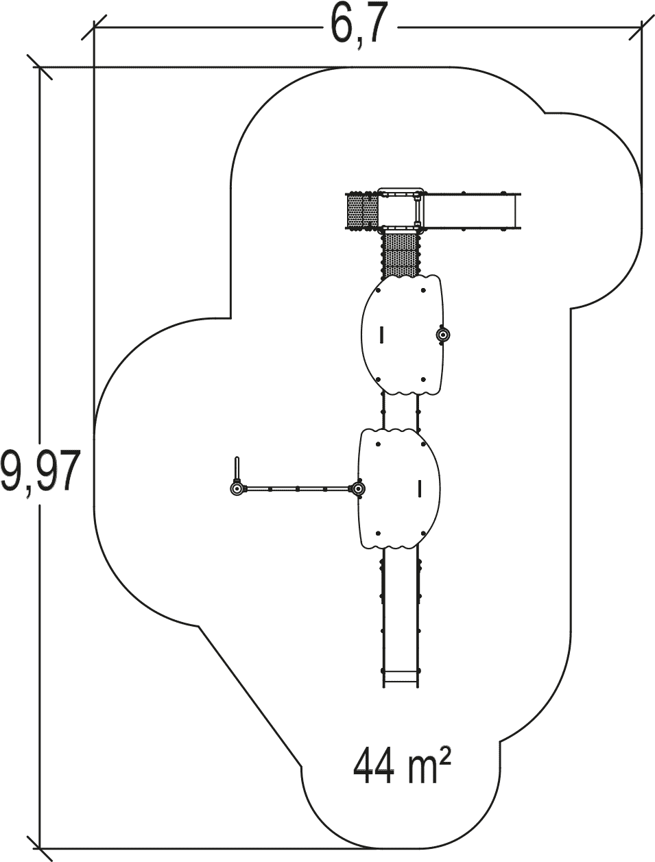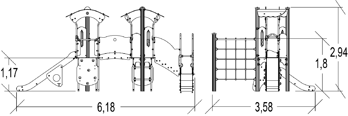Le dimensioni del prodotto sono: 6,18 m di lunghezza, 3,58 m di larghezza, 2,94 m di altezza. L'altezza di caduta libera massima (HCL) è di 1,80 m.