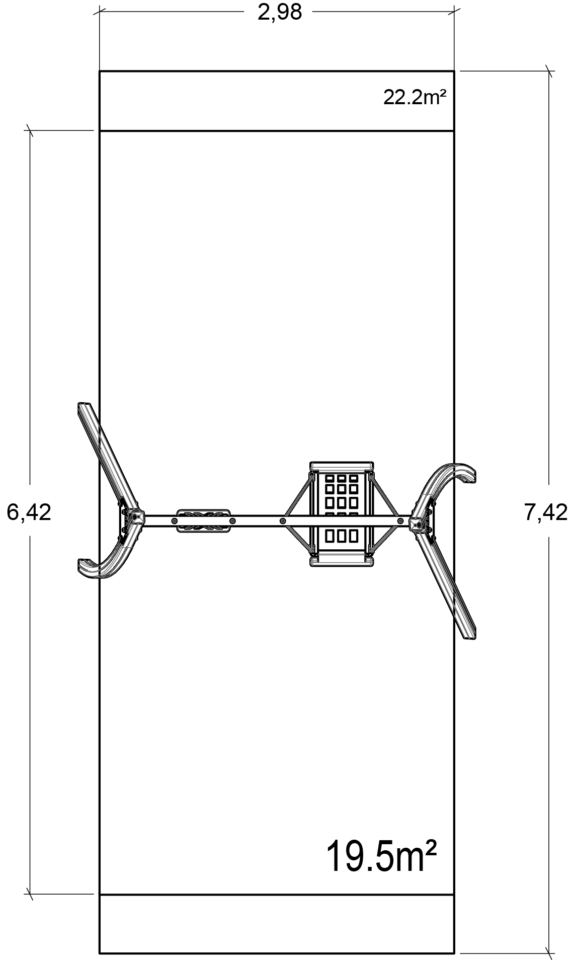 Le dimensioni del prodotto sono: 3,34 m di lunghezza, 1,98 m di larghezza, 2,60 m di altezza. L'altezza di caduta libera massima (HCL) è di 1,37 m.