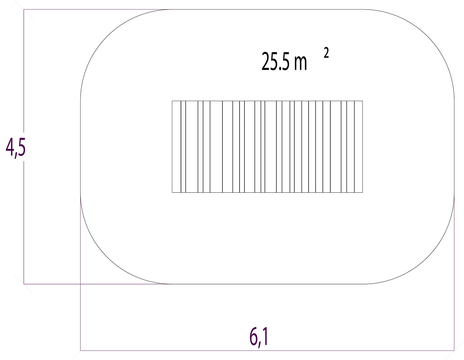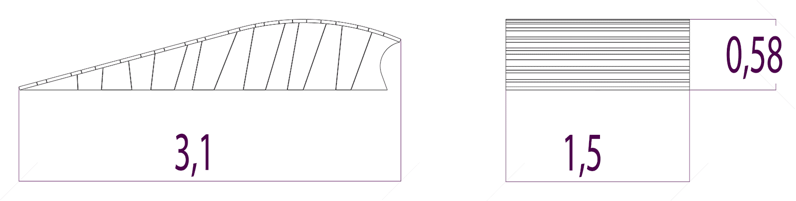 Le dimensioni del prodotto sono: 3,10 m di lunghezza, 1,50 m di larghezza, 0,58 m di altezza. L'altezza di caduta libera massima (HCL) è di 0,60 m.