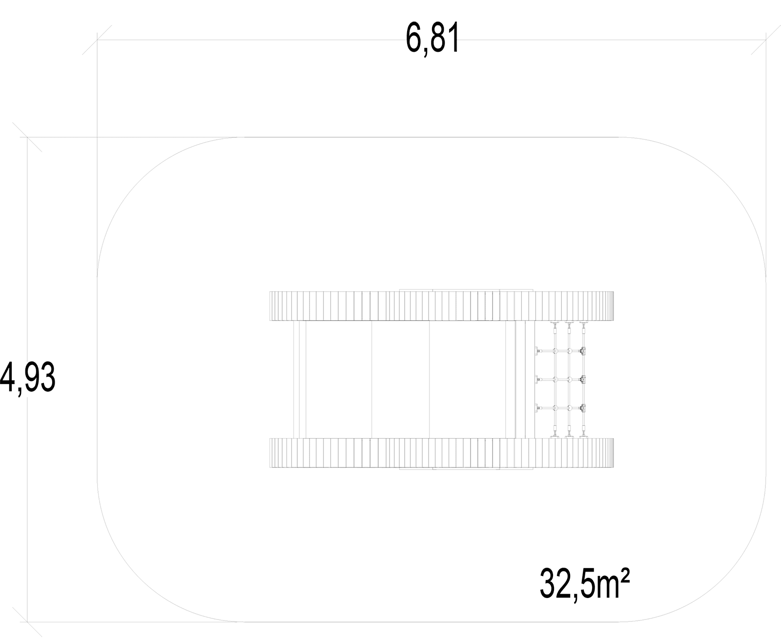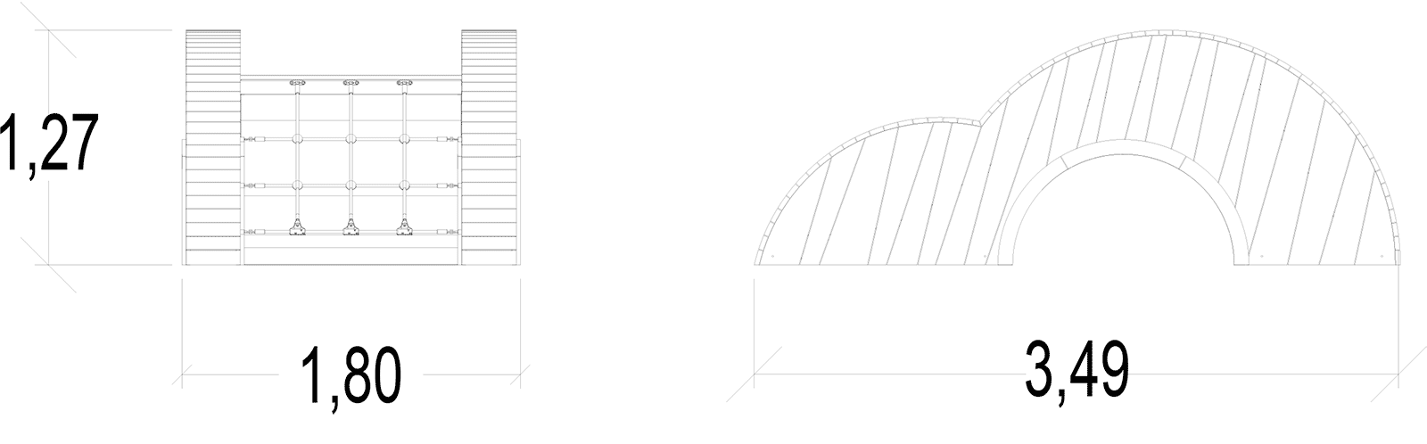 Le dimensioni del prodotto sono: 3,49 m di lunghezza, 1,80 m di larghezza, 1,27 m di altezza. L'altezza di caduta libera massima (HCL) è di 1,30 m.