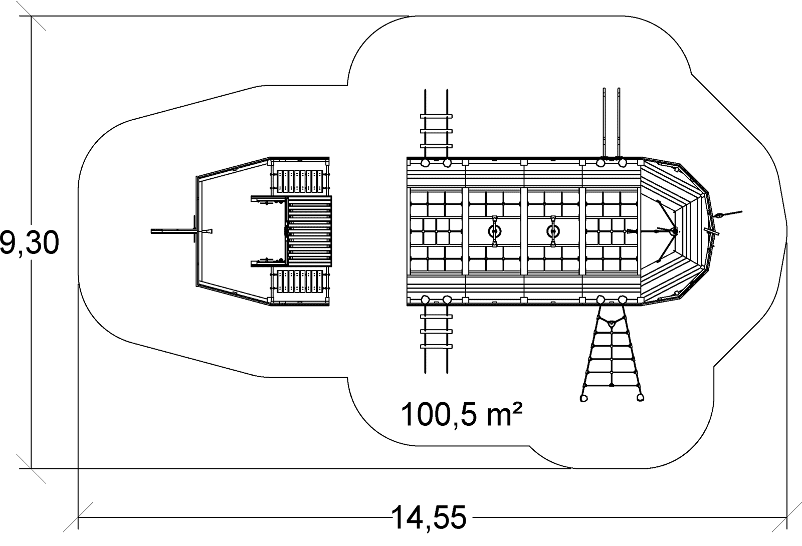 Le dimensioni del prodotto sono: 12,13 m di lunghezza, 6,45 m di larghezza, 3,20 m di altezza. L'altezza di caduta libera massima (HCL) è di 1,50 m.