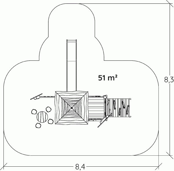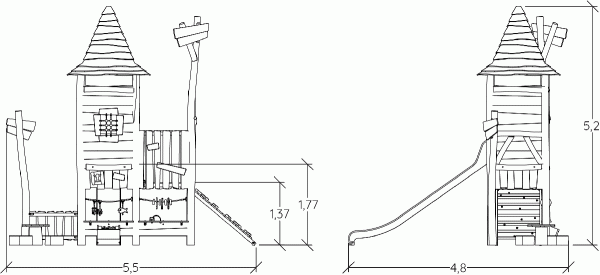 Le dimensioni del prodotto sono: 5,50 m di lunghezza, 4,80 m di larghezza, 5,20 m di altezza. L'altezza di caduta libera massima (HCL) è di 1,77 m.