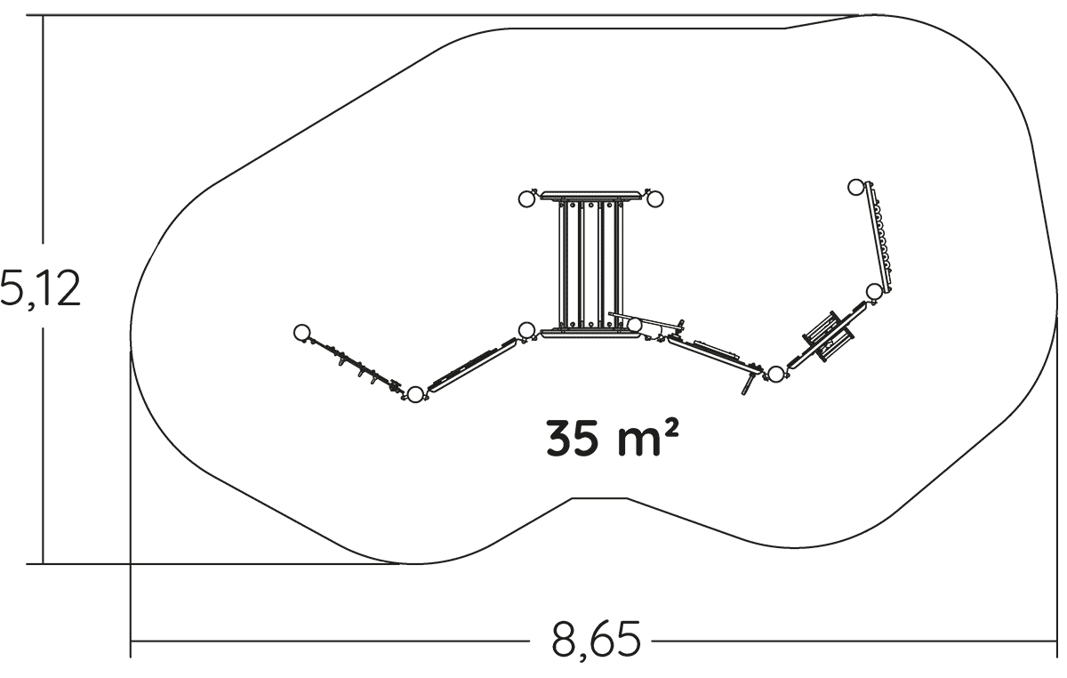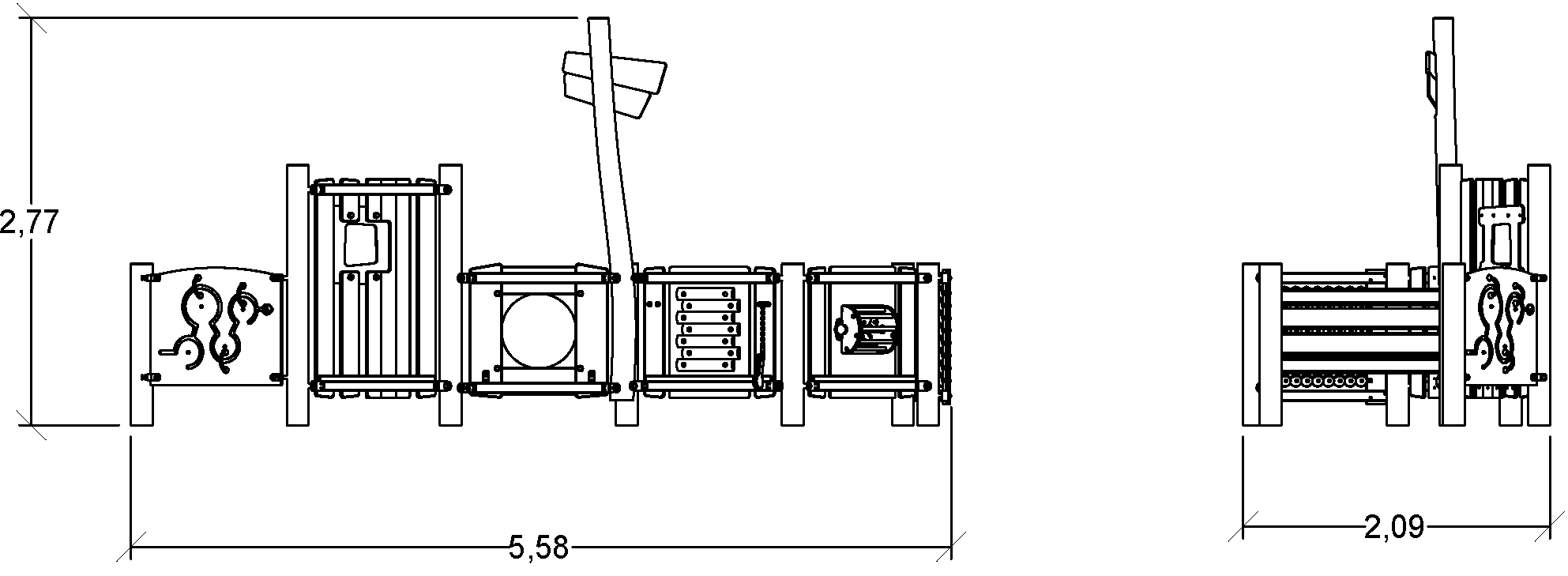 Le dimensioni del prodotto sono: 5,58 m di lunghezza, 2,09 m di larghezza, 2,77 m di altezza. L'altezza di caduta libera massima (HCL) è di 0,60 m.