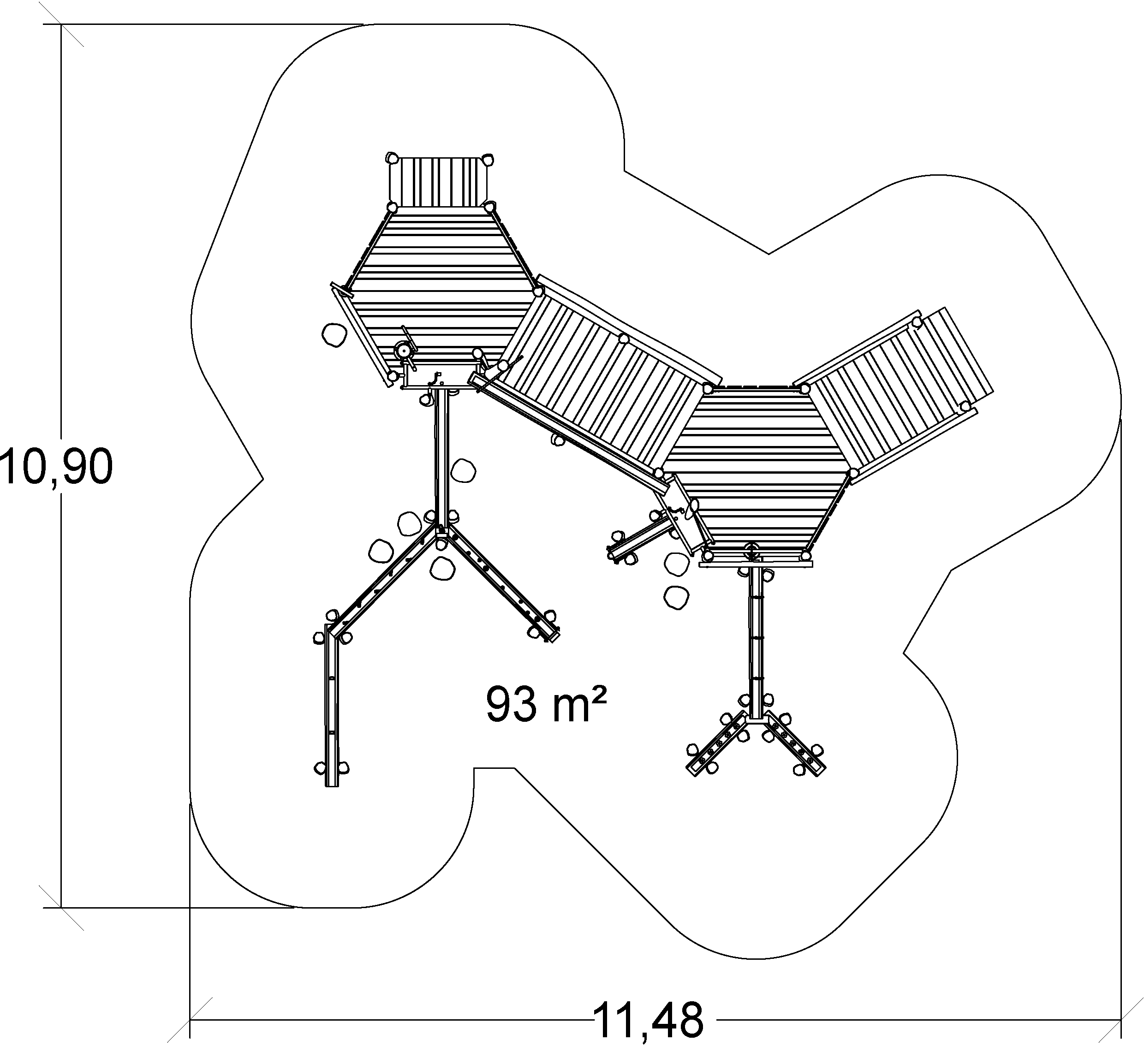 Le dimensioni del prodotto sono: 8,32 m di lunghezza, 7,82 m di larghezza, 3,50 m di altezza. L'altezza di caduta libera massima (HCL) è di 0,60 m.