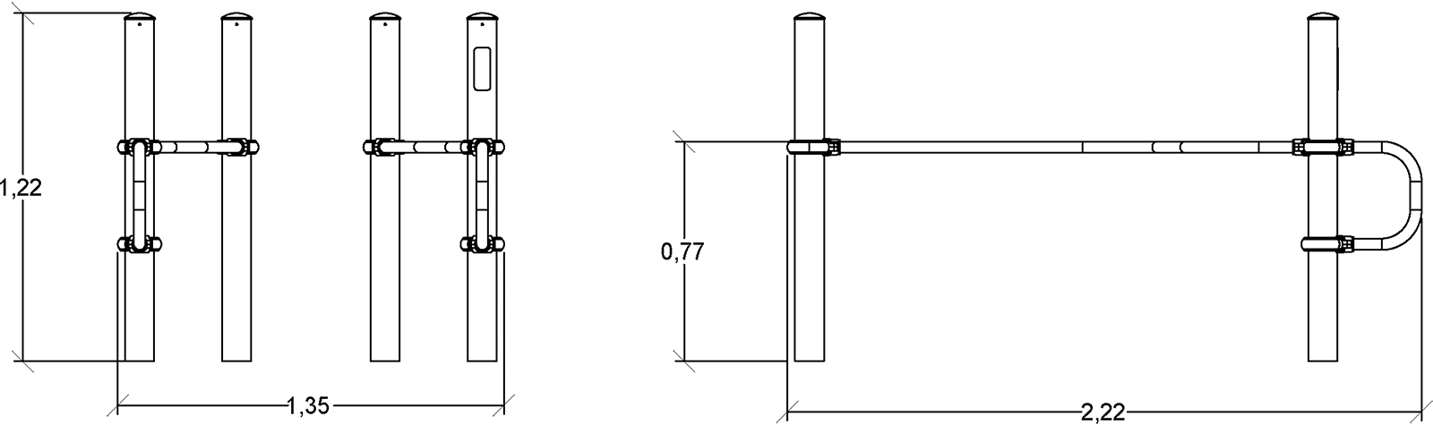 Le dimensioni del prodotto sono: 2,22 m di lunghezza, 1,35 m di larghezza, 1,22 m di altezza. L'altezza di caduta libera massima (HCL) è di 0,78 m.