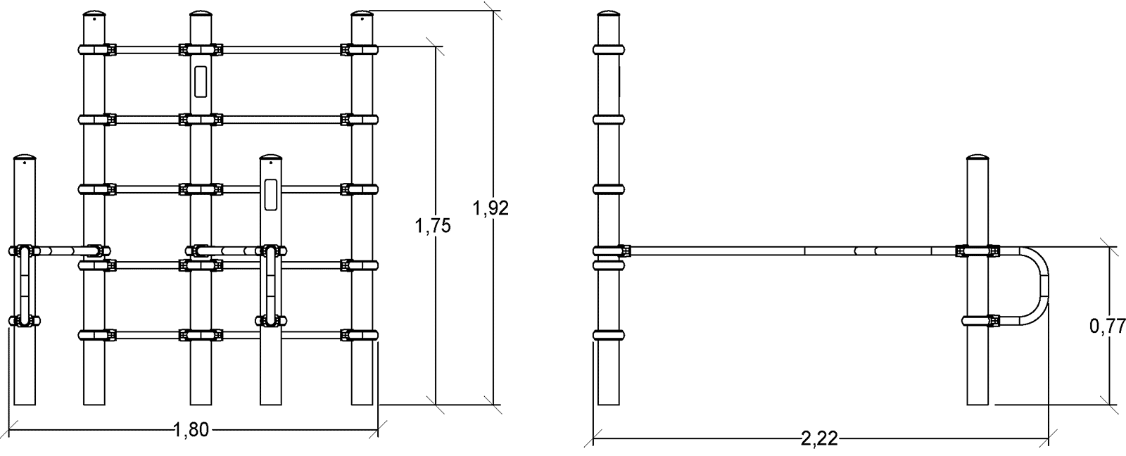 Le dimensioni del prodotto sono: 2,22 m di lunghezza, 1,80 m di larghezza, 1,92 m di altezza. L'altezza di caduta libera massima (HCL) è di 1,70 m.