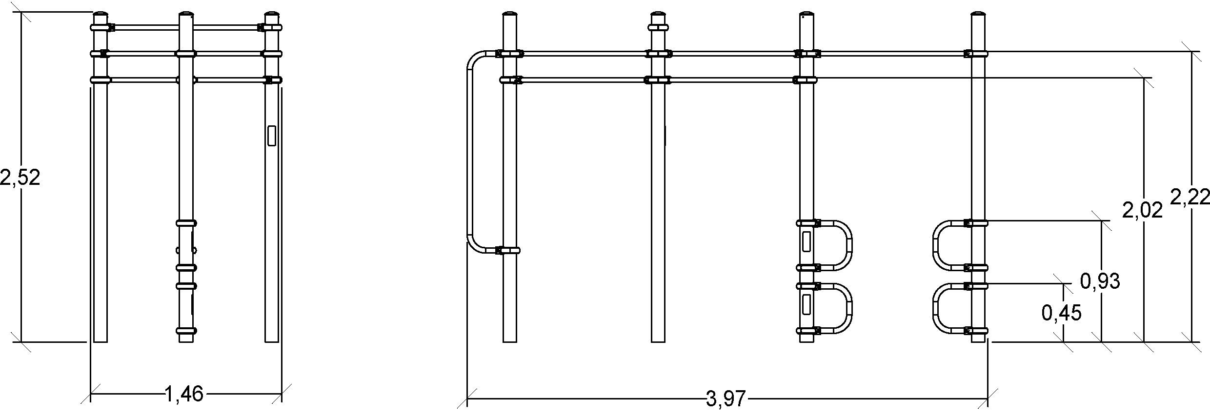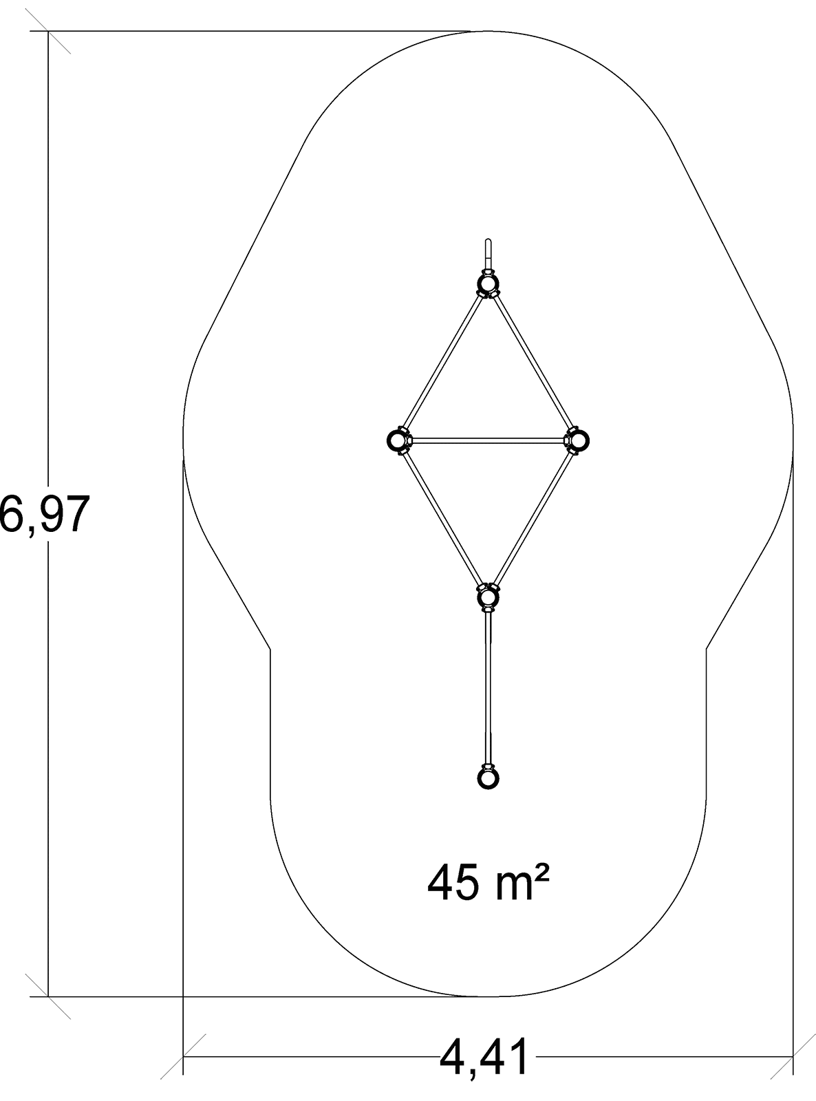 Le dimensioni del prodotto sono: 3,97 m di lunghezza, 1,46 m di larghezza, 2,52 m di altezza. L'altezza di caduta libera massima (HCL) è di 1,40 m.