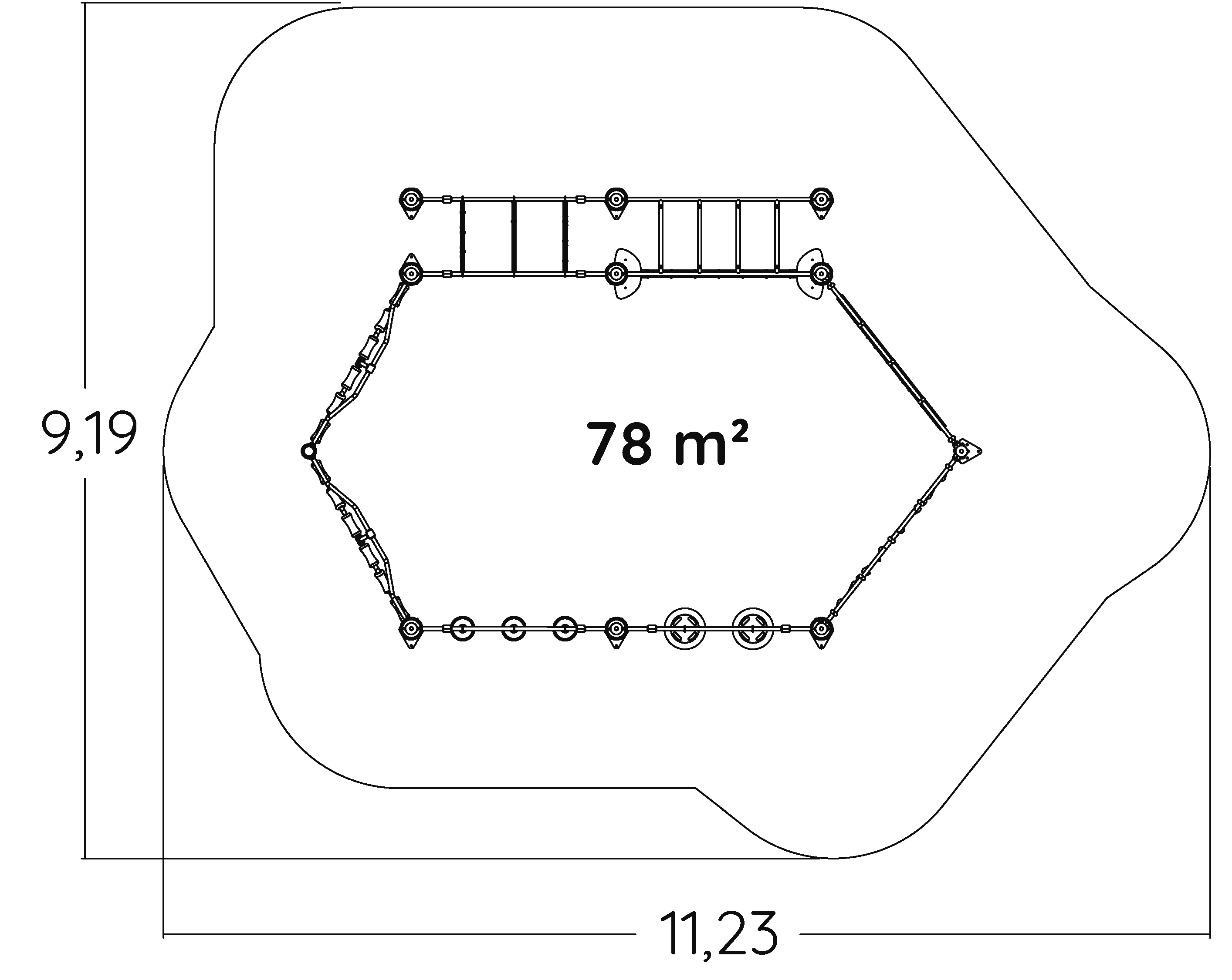 Le dimensioni del prodotto sono: 7,28 m di lunghezza, 4,88 m di larghezza, 2,81 m di altezza. L'altezza di caduta libera massima (HCL) è di 2,46 m.