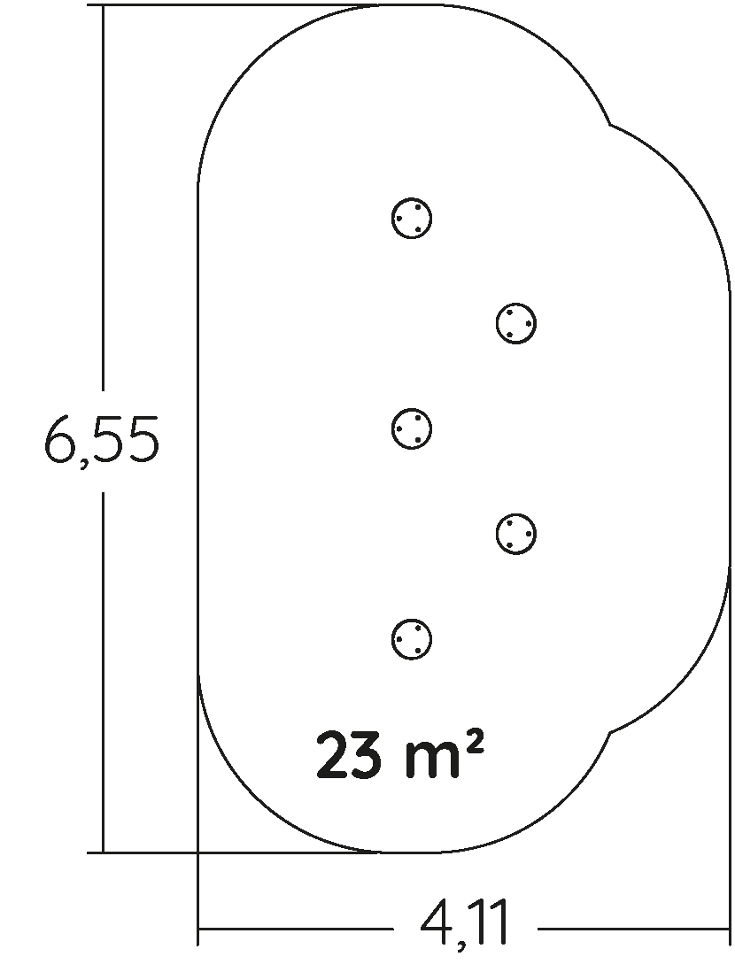 Le dimensioni del prodotto sono: 4,85 m di lunghezza, 2,30 m di larghezza, 1,45 m di altezza. L'altezza di caduta libera massima (HCL) è di 0,60 m.