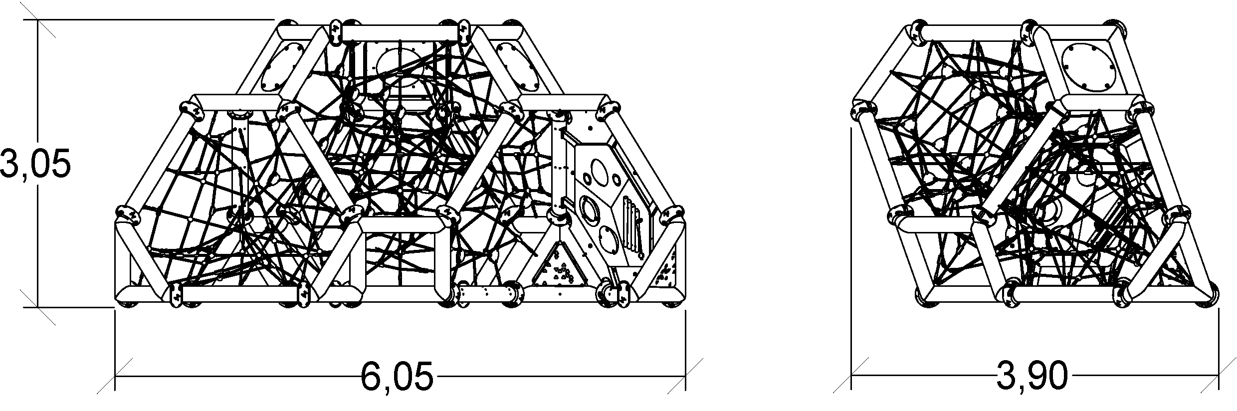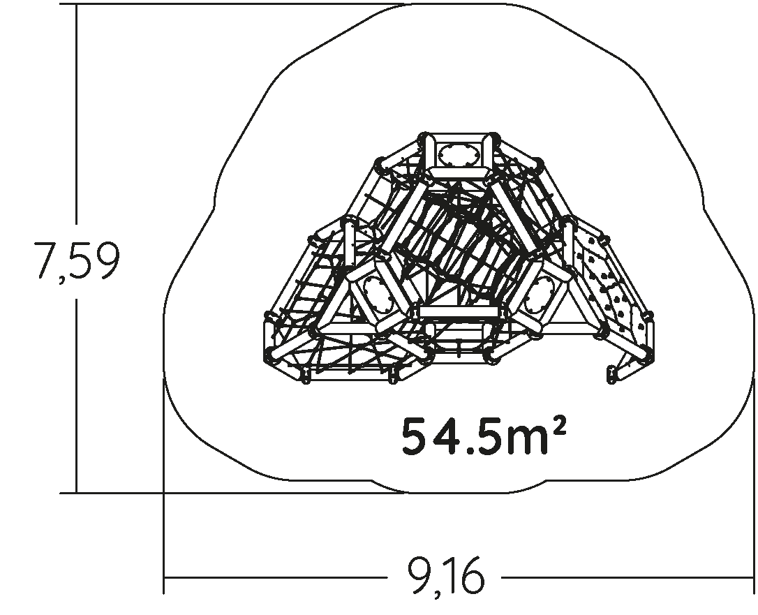 Le dimensioni del prodotto sono: 6,05 m di lunghezza, 3,90 m di larghezza, 3,05 m di altezza. L'altezza di caduta libera massima (HCL) è di 3,00 m.